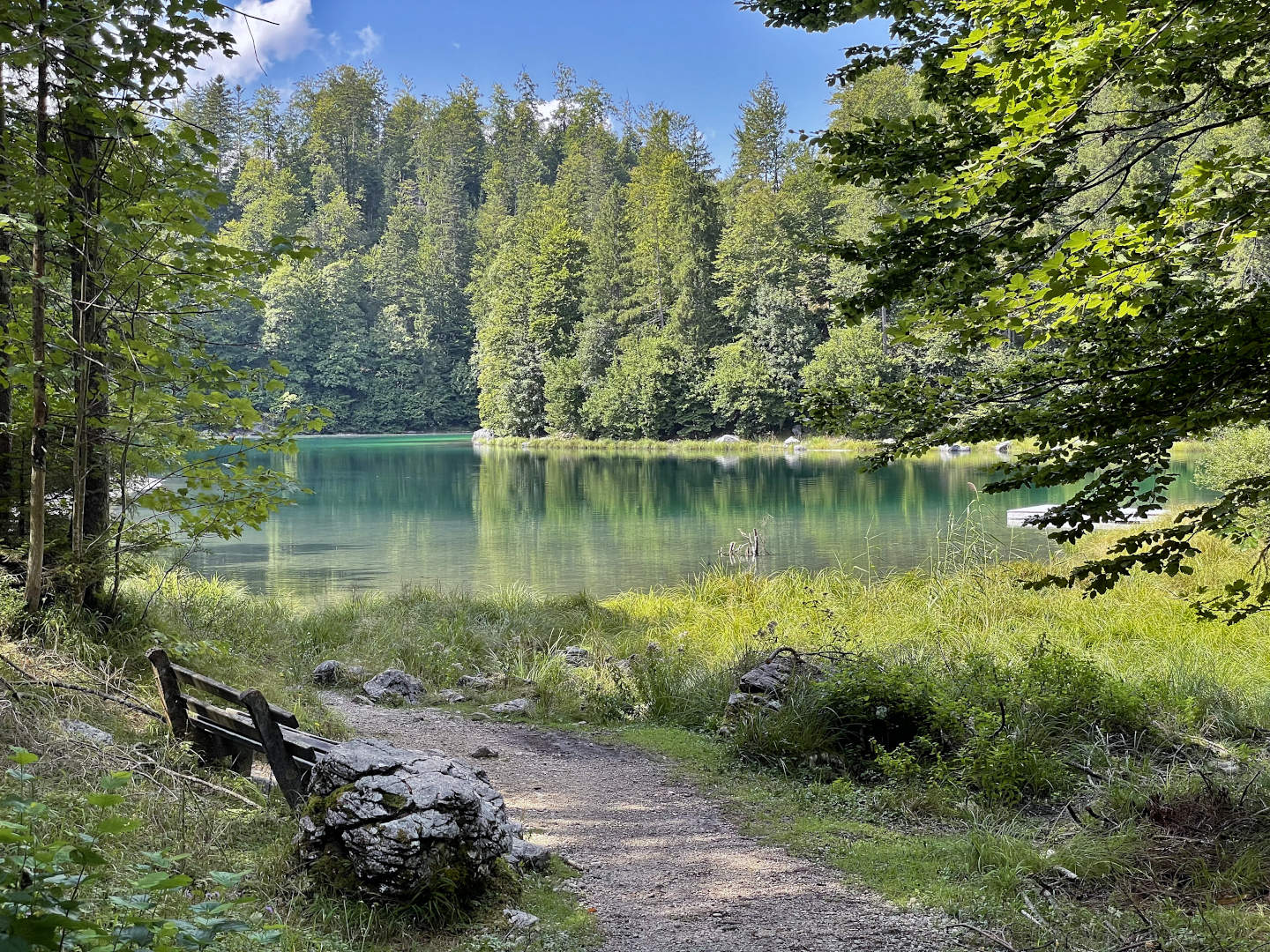 Weiter bergab kommst du kurz bevor du den Großen Ödsee erreichst an einem kleinen Wasserfall vorbei. Von hier aus, führt ein zunächst kleiner Pfad am Ostufer des grünblauen Sees entlang, der zunehmend breiter wird. An mehreren Stellen gibt es die Möglichkeit direkt zum Wasser zu gelangen.